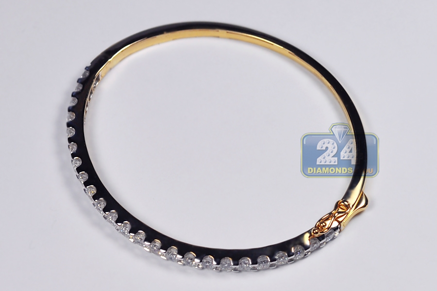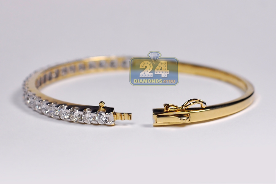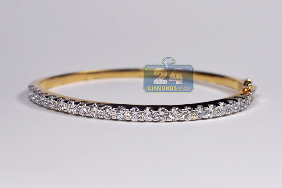 There's no doubt, our splendid oval bangle bracelet delivers the ultimate in elegance and style! Crafted in warm 14k yellow gold, it is polished for adding smooth shimmering finish. It's masterly set with icy white round brilliant-cut genuine diamonds totaling 4.24 carats. The piece features 6.5 inches in inner circle and 4 mm in width. This women's diamond bracelet is so stunning that it will make heads turn for a second look!
