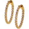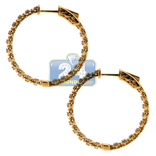 Stylish and affordable, our round hoop earrings are always appropriate! They are professionally crafted in warm 18k yellow gold, and accented with 0.36 carat of round brilliant-cut white diamonds. Our women's diamond hoops measure 30 mm in height and 3 mm in width. They're also closed with comfortable hinged post. These lady's inside-out earrings are quite the conversation piece of jewelry!
