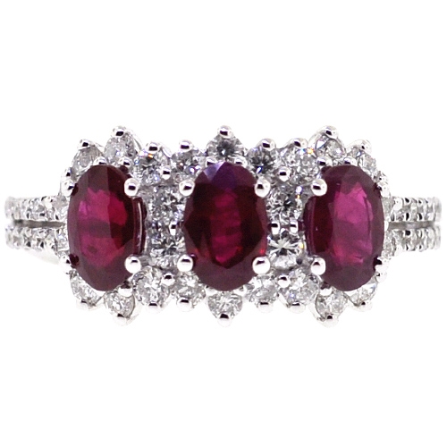 Experience magic of rubies in our truly stunning diamond three-stone ring! It features stylish halo design that lovely created from lustrous 18k white gold, and highly polished for shimmering finish. It is also set with treated oval-cut genuine rubies of 1.79 carat that surrounded by 0.79 carat of icy white round brilliant-cut diamonds. This women's gemstone ring can be your anniversary piece of jewelry as well as statement-making ring for special occasions!