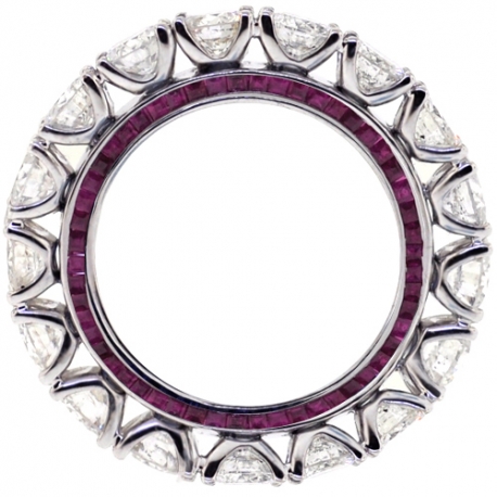 Welcome to the world of high jewelry with our luxurious diamond gemstone eternity ring! Masterly handmade of lustrous 18k white gold with sparkling finish, it is set with icy white round brilliant-cut natural diamonds, all totaling 5.38 carats. The sides of the piece are studded with 1.57 carat of square-shaped natural rubies. This women's wedding band is perfect for adding extra shimmer on special occasions! This piece of jewelry can be produced in any gold color and finger size.