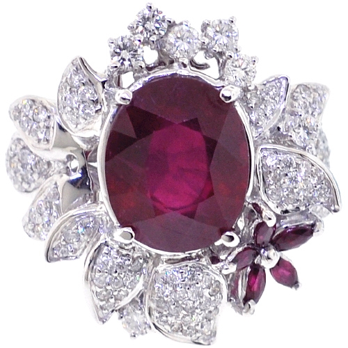 Here is a striking diamond gemstone ring that radiates charm, character and allure! Designed in timeless flower style, the setting is artfully crafted in cool 18k white gold, and highly polished for smooth touch. It's amazed with magnificent treated oval-shaped genuine ruby in the center and small marquise-cut rubies on the side, all totaling 7.58 carats. Sparkle is completed by 0.97 carat of icy white round brilliant-cut diamonds. This women's cocktail ring will bring a unique detail to any outfit!