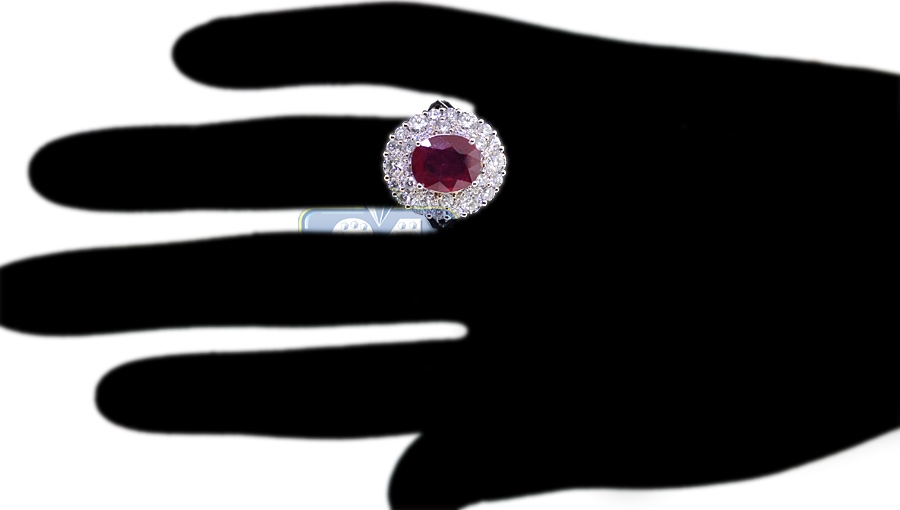 Experience majestic aura of our breathtaking diamond gemstone ring! Its setting is masterly produced from cool 18k white gold, and high-polished for smooth shiny finish. The center is adorned with treated oval-shaped genuine ruby of 5.19 carats. It is surrounded by icy white round brilliant-cut diamonds, all totaling 2.03 carats. Breathtaking from every angle, timeless design of this women's cocktail ring is perfect for any special occasion!