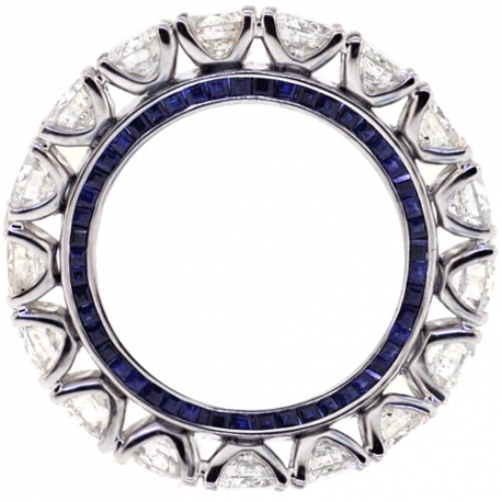 You're looking at fabulous diamond gemstone eternity ring that is sure to turn heads! It's artfully crafted in cool 18k white gold, and encrusted with 5.50 carats of icy white round brilliant-cut genuine diamonds. The sides of the piece are accented with natural blue sapphires of square shape, all totaling 1.39 carat. This exquisite women's wedding band has an ideal balance of modern details and timeless design! This piece of jewelry can be produced in any gold color and finger size.