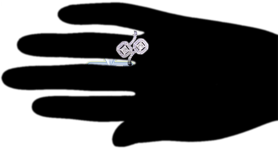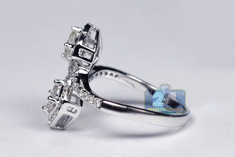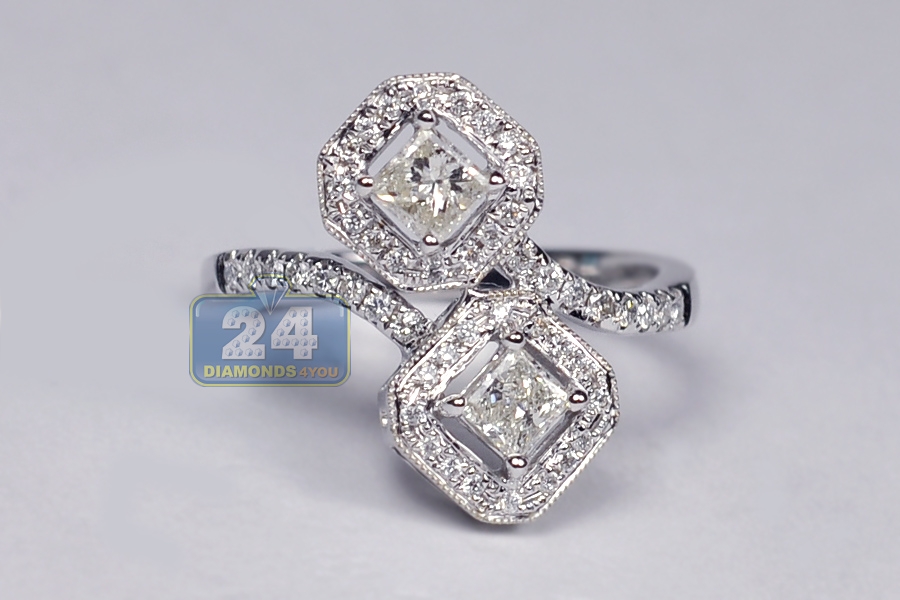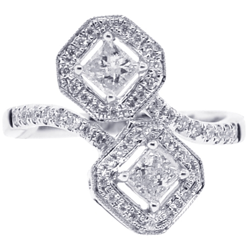 Classic and glamorous are the key-words for our diamond bypass ring! Artfully created from cool 18k white gold, it has polished shimmering finish. The centers are prong-set with two white princess-cut natural diamonds (0.61 carats) that highlighted by icy white round brilliant-cut diamonds (0.29 carat). Get your glitter on with this gorgeous women's solitaire ring!