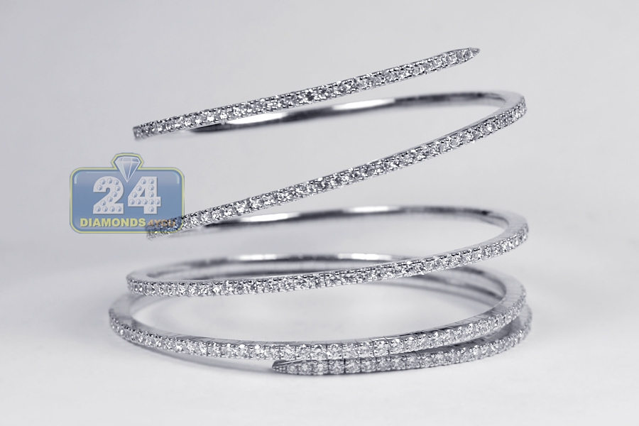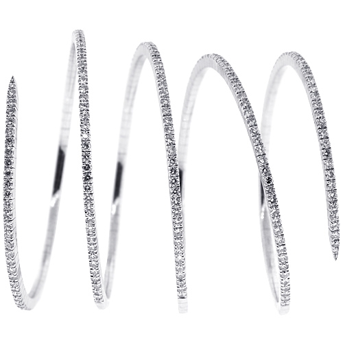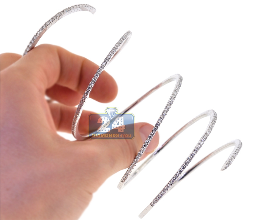 Moving like spring, our diamond bangle bracelet wraps your wrist making an eye-catching chic statement! Artfully crafted in cool 14k white gold, it's perfectly polished for ultra-smooth touch. It also sparkles with 11.42 carats of icy white round brilliant-cut natural diamonds. Approximate length of one circle is 175 mm, height in free form is 80 mm and width of line is 2.5 mm. This women's flexible bracelet is ready to become a part of a heirloom-worthy collection!