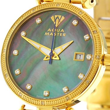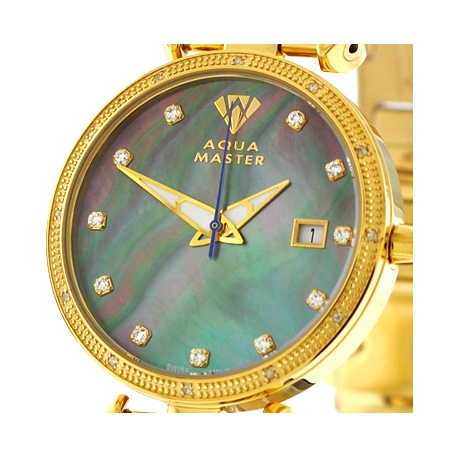 Elegant diamond watch for lady from newest classic collection made by Aqua Master. It has round-shaped case made of stainless steel that covered with long-lasting yellow gold plating. It also has gold plated steel band secured with deployment closure. Black mother-of-pearl dial is amazed with 11 shimmering stones, and protected by scratch resistant mineral crystal. This timepiece sparkles with 20 pieces of genuine diamonds. It's equipped with Swiss movement that has date function. Lovely diamond watch for everyday wear!