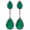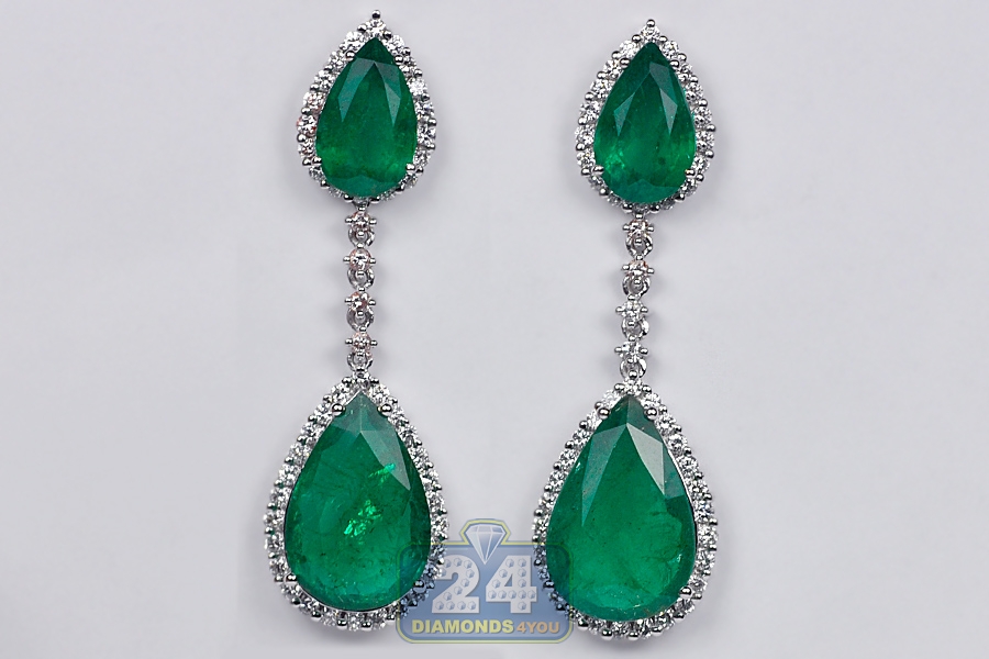 Our elegant pair of diamond emerald drop earrings is glamorous enough to feel like royalty! Artfully created from cool 18k white gold, they're encrusted with 5.95 carats of pear-shaped genuine Colombian emeralds that completed with 1.66 carat of icy white round brilliant-cut diamonds. Secured with user-friendly push back closures, these women's gemstone earrings are a stunning way to transform your entire look!