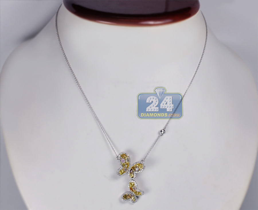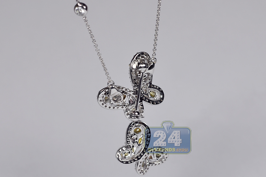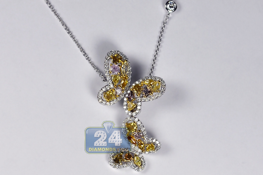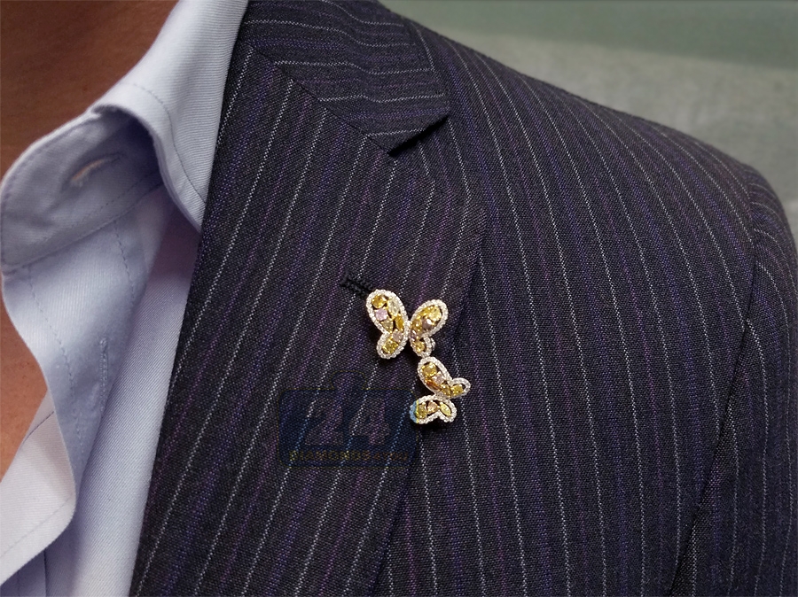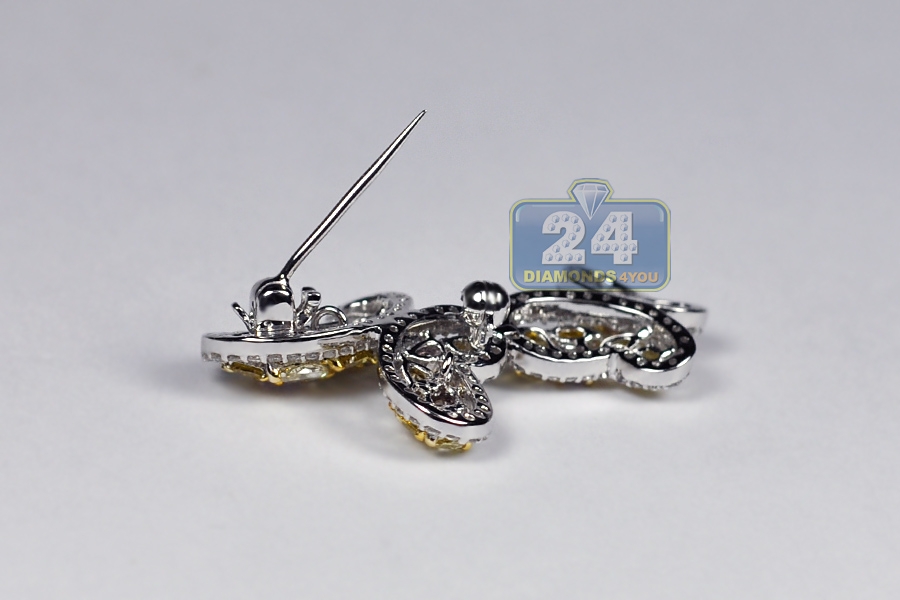 Easily transform our stunning double butterfly brooch into necklace by fastening an elegant chain! They're masterly produced from cool 14k white gold, and encrusted with genuine not-enhanced fancy yellowish diamonds that highlighted by icy white round brilliant-cut diamonds, all totaling 2.84 carats. The whole piece measures 17 inches in length. This women's unique jewelry is filled with romance and allure!
