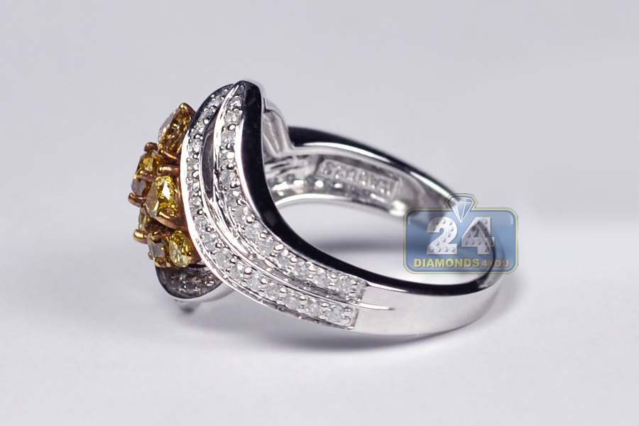 Show up wearing our gorgeous diamond cluster ring! It is expertly produced from cool 14k white gold, and high-polished for sparkling finish. The center of the piece features cluster of mix-shaped genuine (not-enhanced) fancy yellow diamonds of 1.00 carat. The shoulders are accented with icy white round brilliant-cut diamonds, all totaling 0.57 carat. This women's bypass-style ring will have all eyes on you!