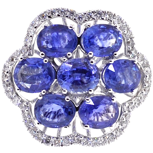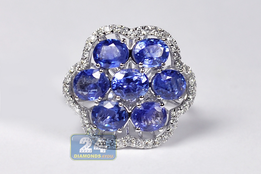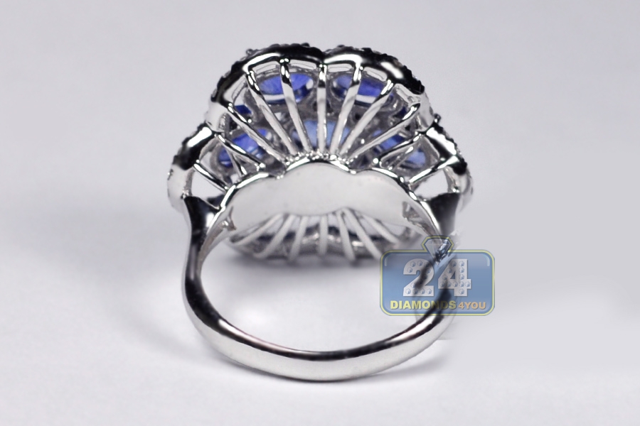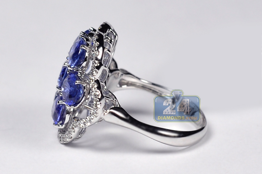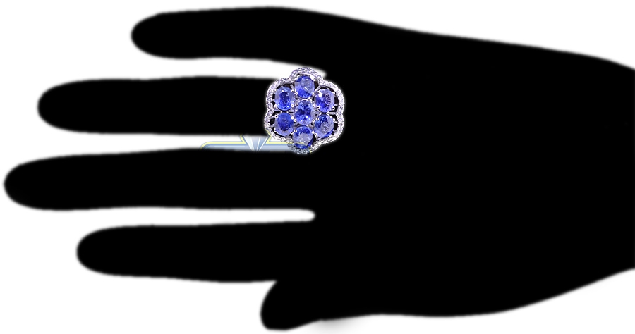It's time to light up the night with our lovely gemstone diamond ring! The setting is designed in floral motif, and expertly created from cool 14k white gold with ultra-shiny finish. The center of this piece features cluster of heated blue oval-cut genuine tanzanites (5.39 carats) that surrounded by icy white round brilliant-cut diamonds (0.55 carat). This is a statement-making women's ring with a fusion of modern!