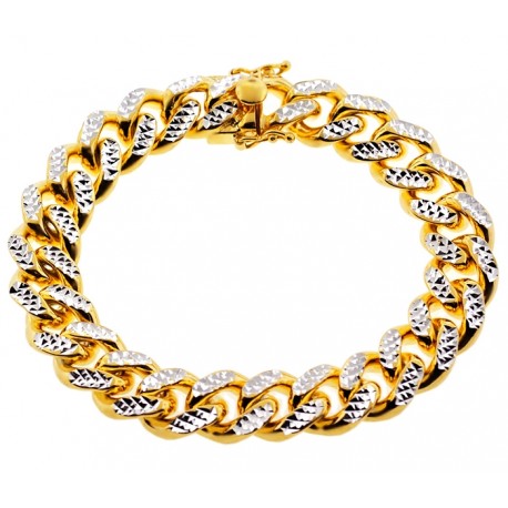 Featuring 14 mm in width, 9 inches in length and approximately 102 grams in weight, our solid miami cuban bracelet has trendy look that you were born to rock! It's professionally handmade of precious 925 sterling silver, and covered with yellow gold plating that helps prevent tarnishing and gives a bright color. The piece of jewelry also shines with icy diamond cut pattern. Enjoy wearing this handsome cuban link bracelet!